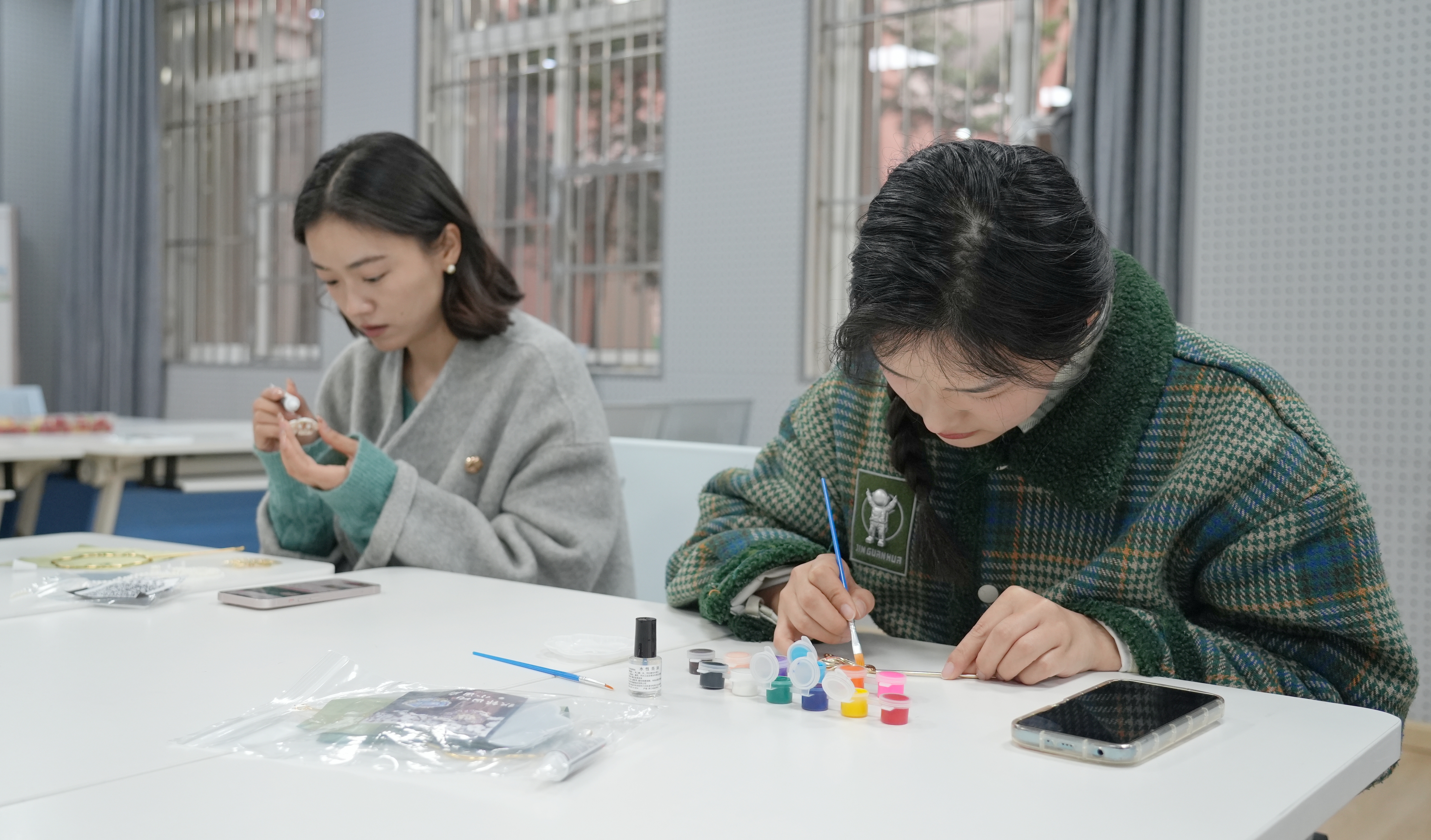 活动现场氛围温馨、其乐融融,工作人员早已备好织锦镜面小团扇、非遗手绳手串等手工材料包,色彩丰富的丝线、精致的扇面、多样的配饰整齐摆放,静待师生创作。活动中,大家手持材料包,或专注构思团扇纹样,穿针引线、搭配织锦,将巧思融入扇面;或精心挑选绳线,编绕打结、串珠搭配,让普通的绳线变成独具匠心的手绳手串。从纹样设计到成品成型,从技巧摸索到创意落地,师生们相互交流、彼此指导,在一针一线、一编一绕中沉浸手作乐趣,感受非遗文化的独特魅力。